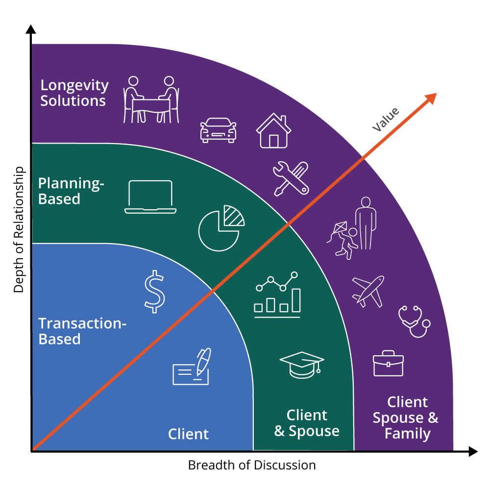 Longevity-Solutions: The longevity-solutions financial professional enjoys the greatest degree of client intimacy and has the deepest relationship with his or her clients and their families. The longevity-solutions proposition also offers the widest range of discussions and product solutions. For example, client seminars engage entire families on topics that address the broader context of living longer (e.g., education and professional development across the lifespan) or the future treatment and cost of managing chronic disease. Adult children may be engaged as an integral part of the relationship and, where appropriate, serve to facilitate discussions of what the client and his or her family may want in old age, such as where to live and how.