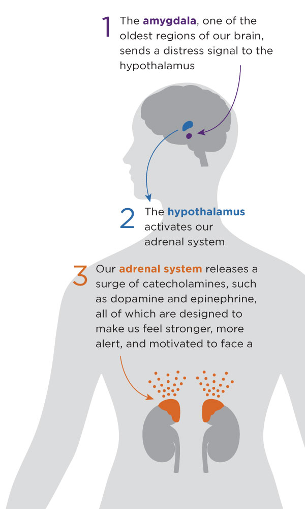 What happens when we feel threatened or scared? Our amygdala, one of the oldest regions of our brain, sends a distress signal to the hypothalamus (see diagram). This kicks our adrenal system into gear, releasing a surge of catecholamines, such as dopamine and epinephrine, all of which are designed to make us feel stronger, more alert, and motivated to face a threat.