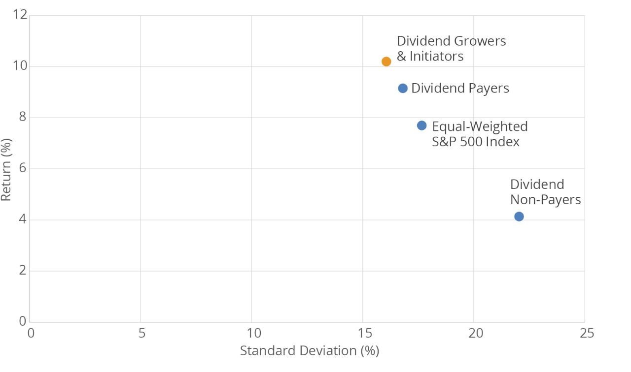 This link between dividend payments and stronger, less volatile performance shows up in the data, too: A study by Ned Davis Research makes it clear that non-dividend-paying companies and those that cut their dividends have historically underperformed their peers. Companies that opted not to pay dividends were not only more volatile (as measured by standard deviation1) but also underperformed compared to those that grew, initiated, or maintained a dividend (FIGURE 1).