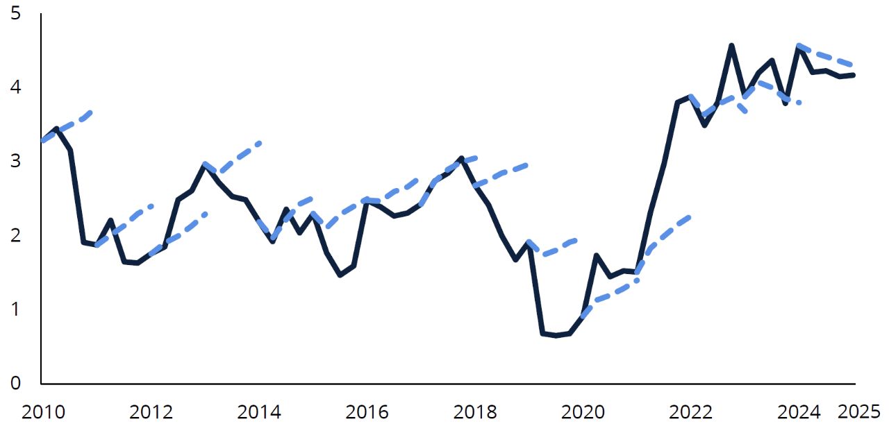 Data as of 12/31/25. Past performance does not guarantee future results. The dotted lines indicate the median estimate of interest-rate movement by economists at the beginning of each year. Data Sources: Philadelphia Federal Reserve, FactSet, and Hartford Funds, 1/26.