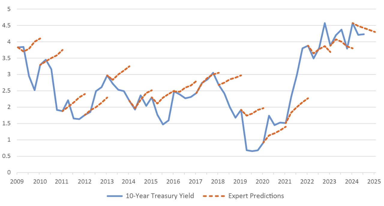 10-Year Treasury Yield (%) vs. Expert Predictions