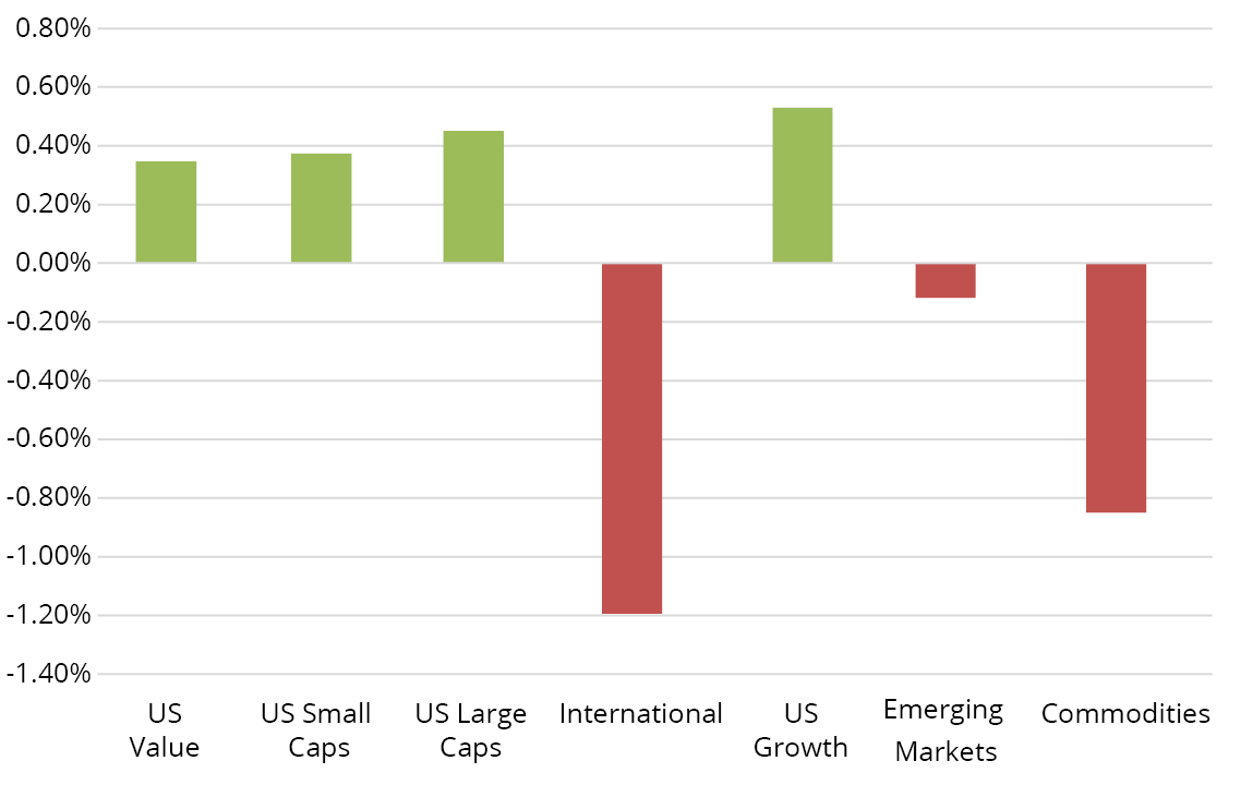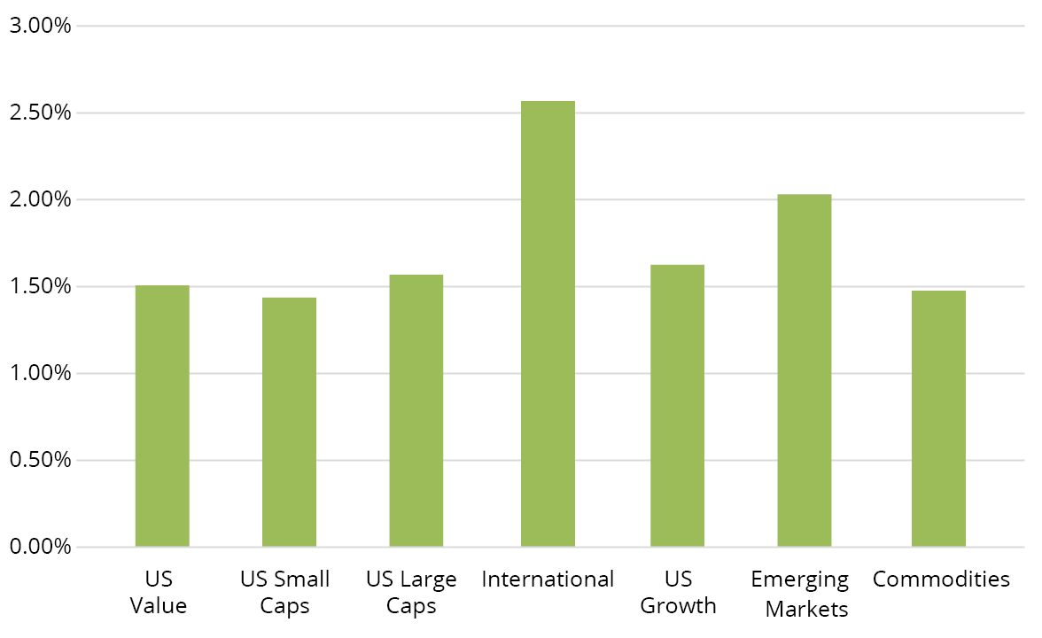 International is represented by the MSCI EAFE Index, which represents large- and mid-cap equities across developed markets in Europe, Australasia, and the Far East, excluding the US and Canada, providing international developed market exposure.