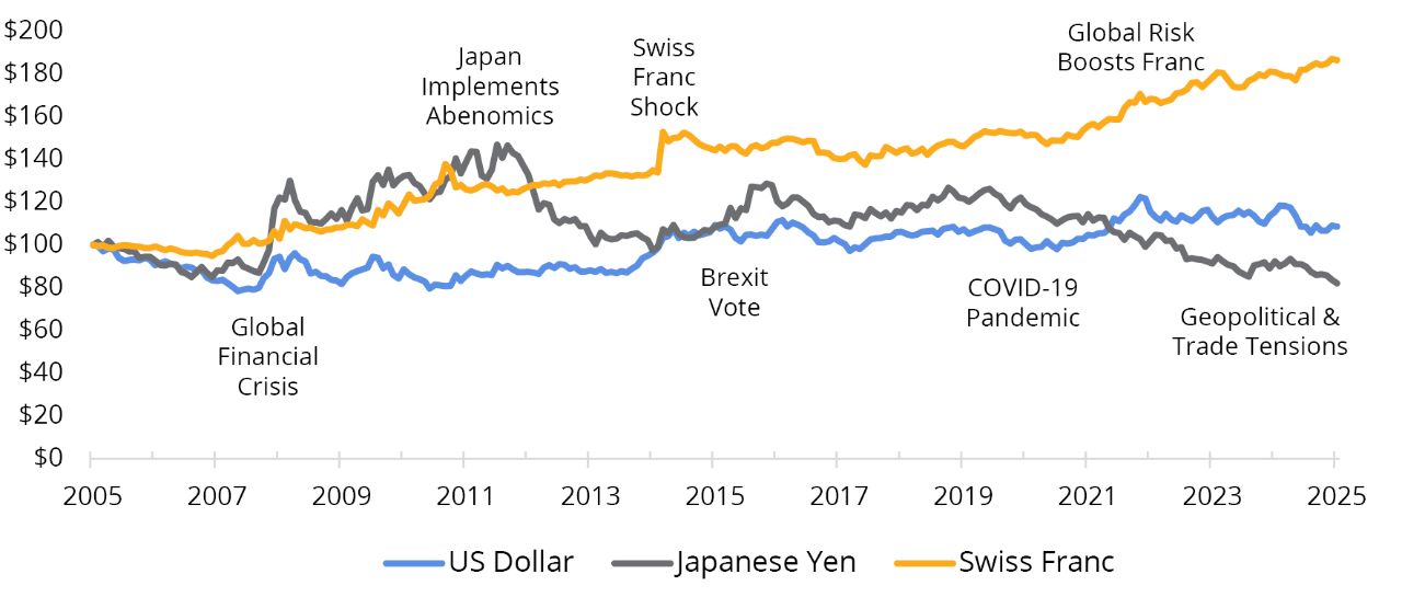 Other factors are harder to measure; wars, natural disasters, or shifts in trade policies can shake up currency markets in unpredictable ways. And when uncertainty rises, investors often flock to “safe-haven” currencies such as the USD, Japanese yen, or Swiss franc, driving up their value—but not always in sync (FIGURE 1).