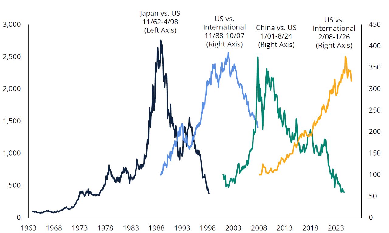 Secular investment opportunities can be especially pernicious, as they frequently present themselves as a “new paradigm,” driven by innovation or structural change. And the longer leadership persists, the more the theme appears to be validated by its long-term performance. To gain perspective on today’s cycle, we revisit the defining secular growth stories of the past 75 years to explore whether familiar patterns are reemerging, or whether this time is truly different.