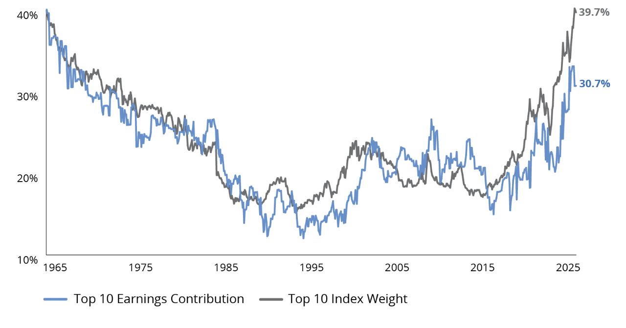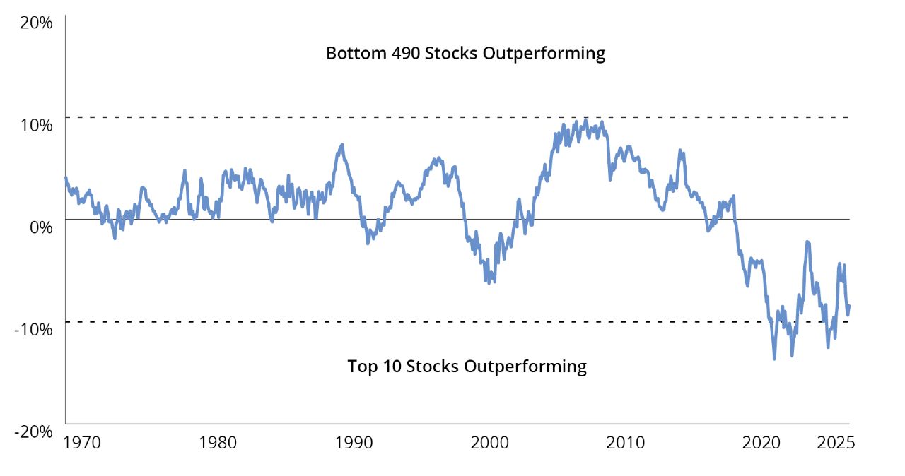 The US stock market has reached its highest concentration level in 60 years, with the top 10 stocks comprising a weighting of 39.7%.1 While there’s always an urge to proclaim “this time is different,” market history tells us that while the plot may change, the story often ends the same.