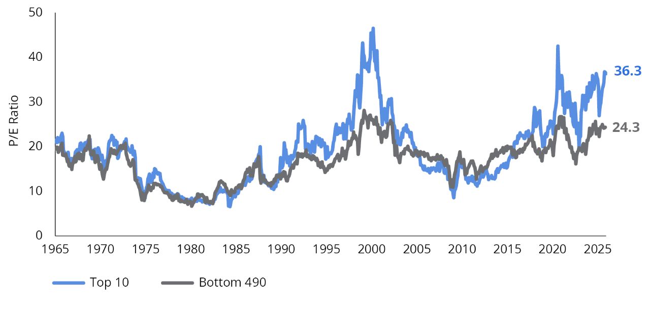 2. The price-to-earnings ratio (P/E ratio)2 of the top 10 stocks compared to the bottom 490 stocks is at an extreme not seen since the peak of the dot-com bubble (excluding the COVID-19 period, which affected earnings figures) (FIGURE 3).