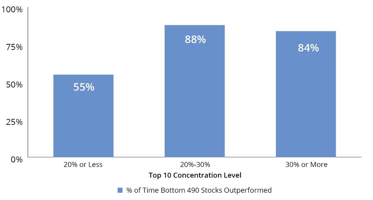 4. When concentration in the top 10 is 30% or more, the bottom 490 have historically outperformed 84% of the time over the next five years (FIGURE 6).