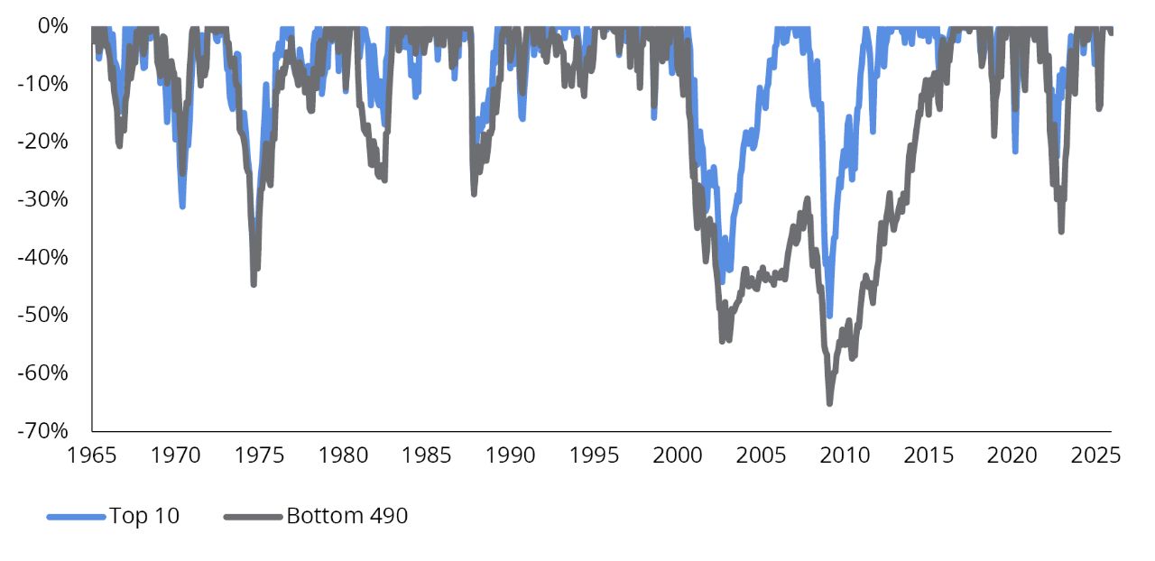 3. Even after taking into account the outperformance of the top 10 in recent years, the bottom 490 have outperformed the top 10 in 70% of 5-year rolling time periods since 1970 (FIGURE 5).