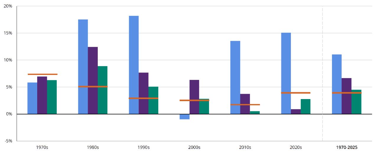 Chart Data: 1970-2025. Past performance does not guarantee future results. Indices are unmanaged and not available for direct investment. The average annual return for inflation (as measured by the CPI, a measure of change in consumer prices as determined by the US Bureau of Labor Statistics) during this period was 3.92%. For illustrative purposes only. Data Sources: Morningstar and Hartford Funds, 4/26.