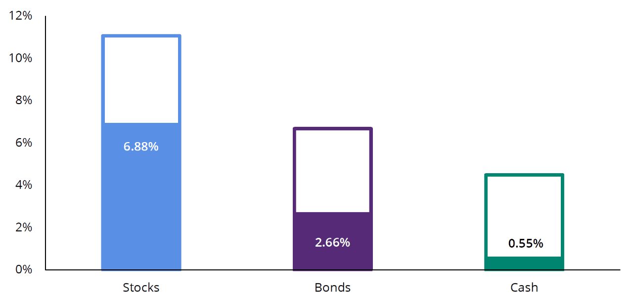 Inflation has varied widely from decade to decade, shaping investor outcomes more in some periods than others. Even so, stocks have historically been the most effective way investors have stayed ahead of inflation over the long term, though they may experience periods of significant volatility. Bonds have tended to play a stabilizing role, helping balance those swings while delivering stronger returns than cash over time.